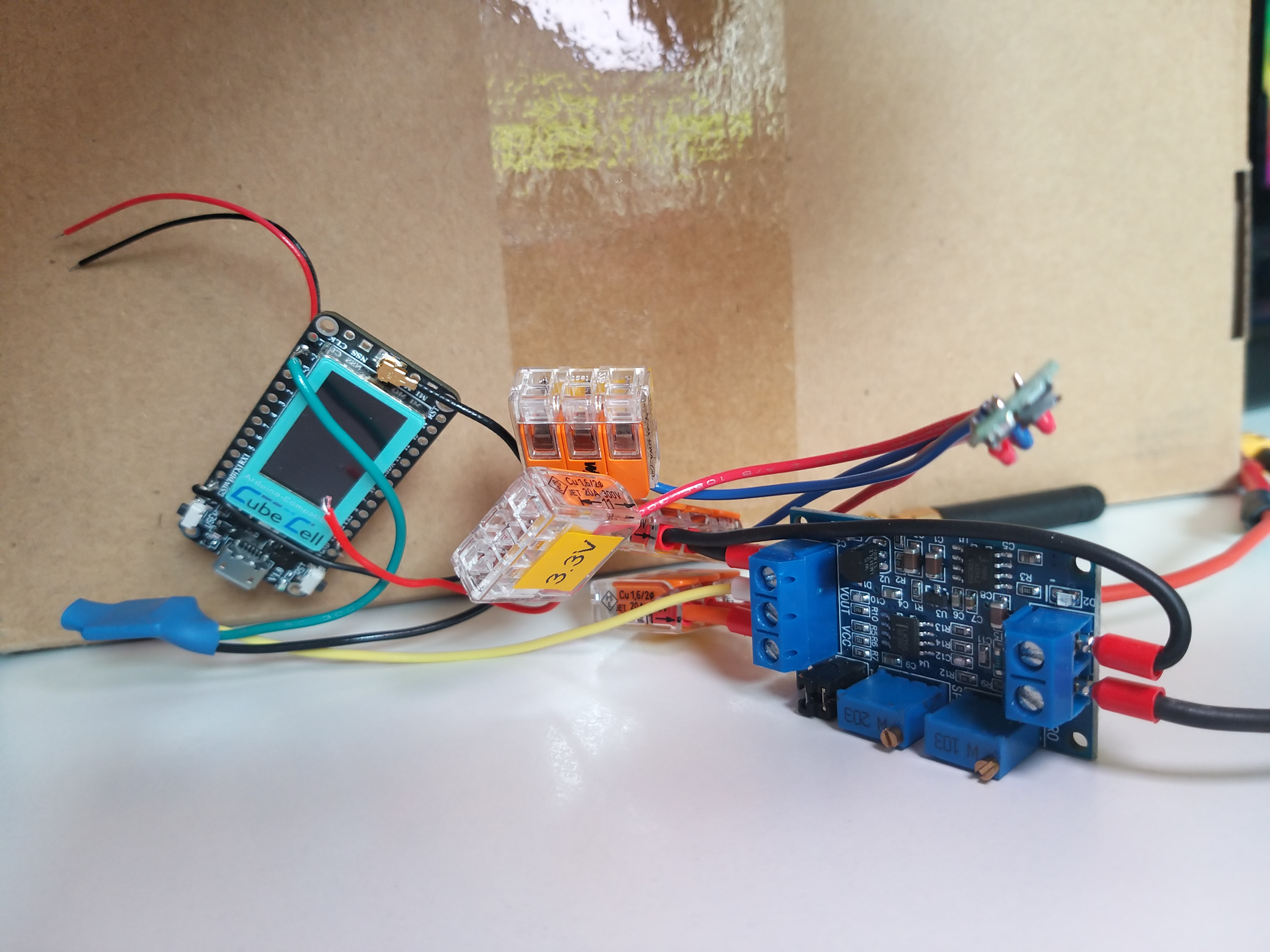 Auf Basis der Mikrocontroller-Entwicklungsplatform Heltec CubeCell Dev-Board Plus wurde ein erster Prototyp entwickelt. Dieser misst mit Hilfe eines “4-20mA”-Modul den Grundwasserstand. Dabei wandelt das Modul den gemessenen Strom, in ein für den Mikrocontroller verständliches analoges Signal (Spannung) um. Der Mikrocontroller liest dieses aus und sendet es über LoRaWAN an bspw. das The Things Network.