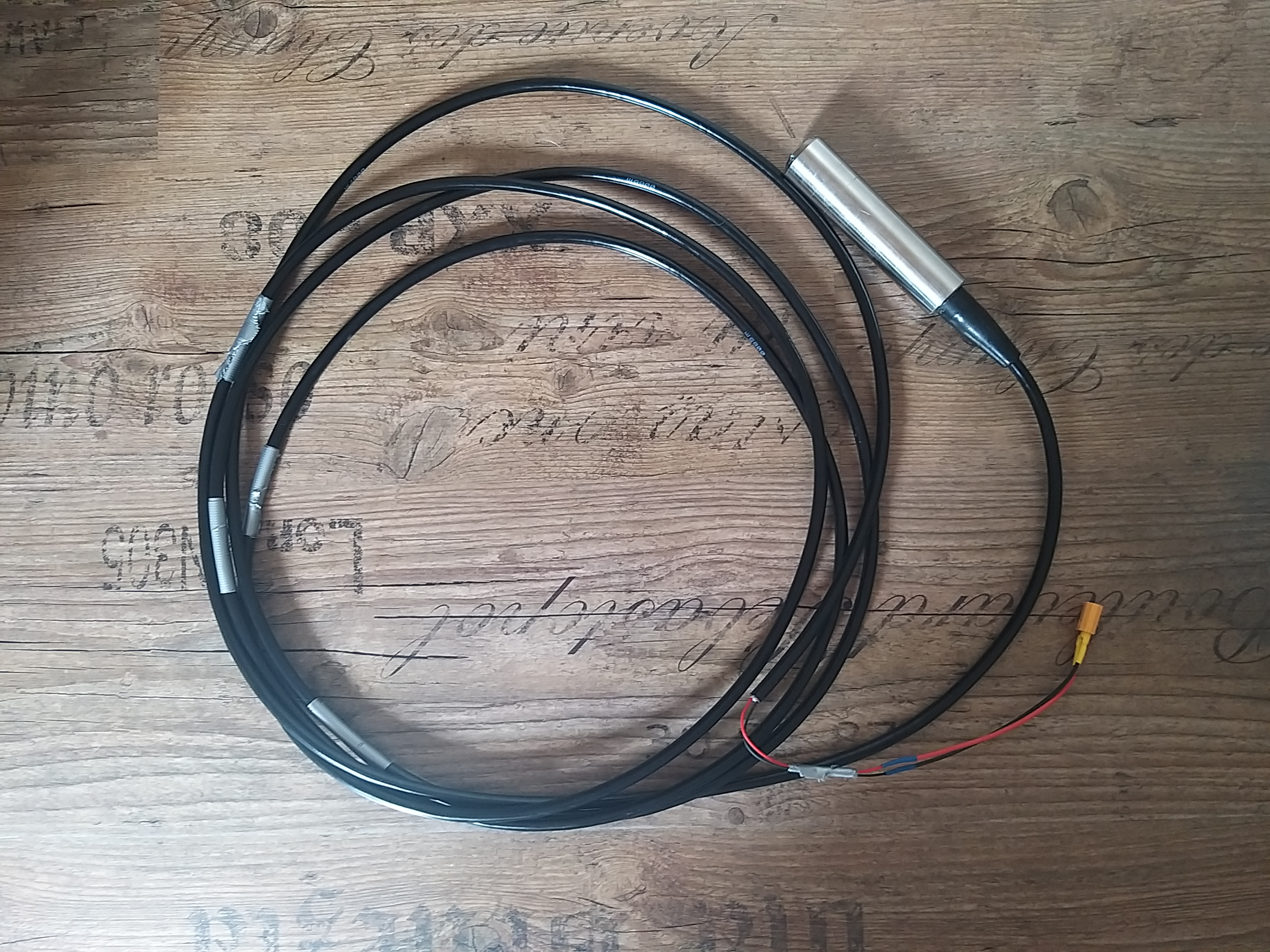Die Sonde kann bis zu einer Tiefe von 5 Metern messen. Die Hardware ist aber auch kompatibel zu anderen Längen. Lediglich die Berechnung vom analogen Signal, hin zu einer Tiefe in cm müsste angepasst werden. Die Klebebandmarkierungen wurden genutzt um den Sensor zu Evaluieren. Jede Markierung entspricht einer Tiefe in 1 Meter Schritten. So haben erste Tests gezeigt, dass der Sensor durchaus linear reagiert.