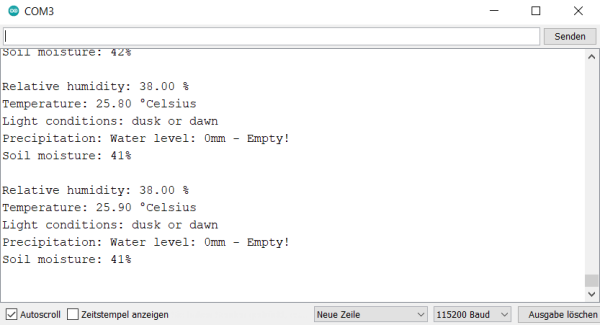 Secondly, we tested both the Arduino and the ESP32 version of our project. Here we could see that the sensors by the ESP32 were less sensible which leads to less exact measurements. For example, the LDR (Photoresistor) is less sensible in case of the ESP version and shows the same values for different light conditions. It was much more sensible by the Arduino board.The same is true for the water level sensor.