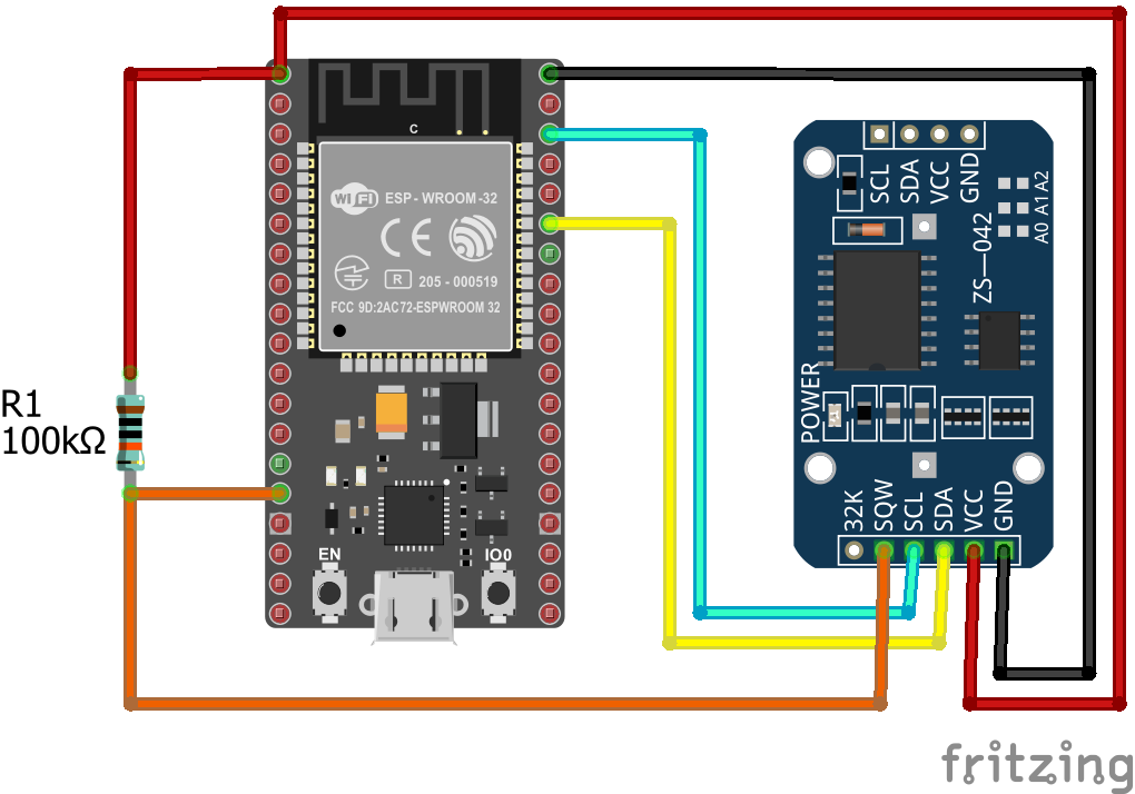 As the DS3231 is an open drain device, the SQW pin connected to one of the RTC_GPIO pins needs to be pulled to high voltage using a pullup resistor. In the case of the Arduino UNO sketch, the Arduino's internal pullup resistor was used. The ESP32 also has internal pullup resistors, but their value strongly fluctuates from module to module and pin to pin and generally lies between 30 - 80 kΩ. Furthermore, it is somewhat complicated to control the pins during deep sleep mode to activate the pullups. Therefore, a 100kΩ external pullup resistor was used to connect the interrupt pin to 3.3V which also results in a lower current being drawn when the interrupt is triggered.