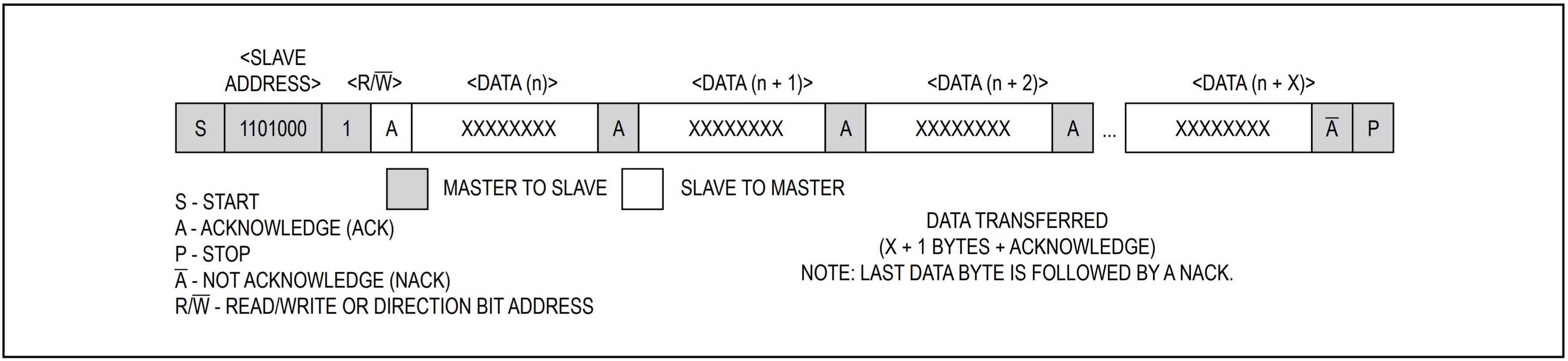 In slave transmitter mode (figure 2), the slave will send one byte of data, followed by an ACK signal by the master. If the slave receives the ACK signal, it continues with the next byte and so on. The transmission ends when the master does not respond to a byte by sending a not acknowledge (NACK) signal which is followed by the stop signal.