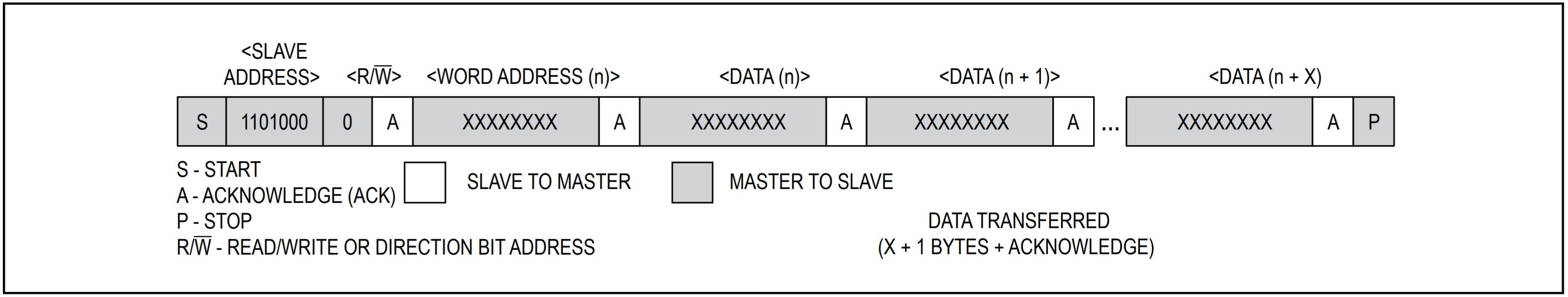 In slave receiver mode (figure 3), the communication works the other way around, the master sends one byte, the salve sends an ACK signal and the next byte is transmitted. The communication stops when the master issues a stop signal after the slaves ACK signal.
