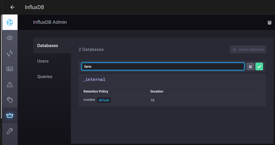 Open InfluxDB dashboard from the sidecard and create a new database named “farm”