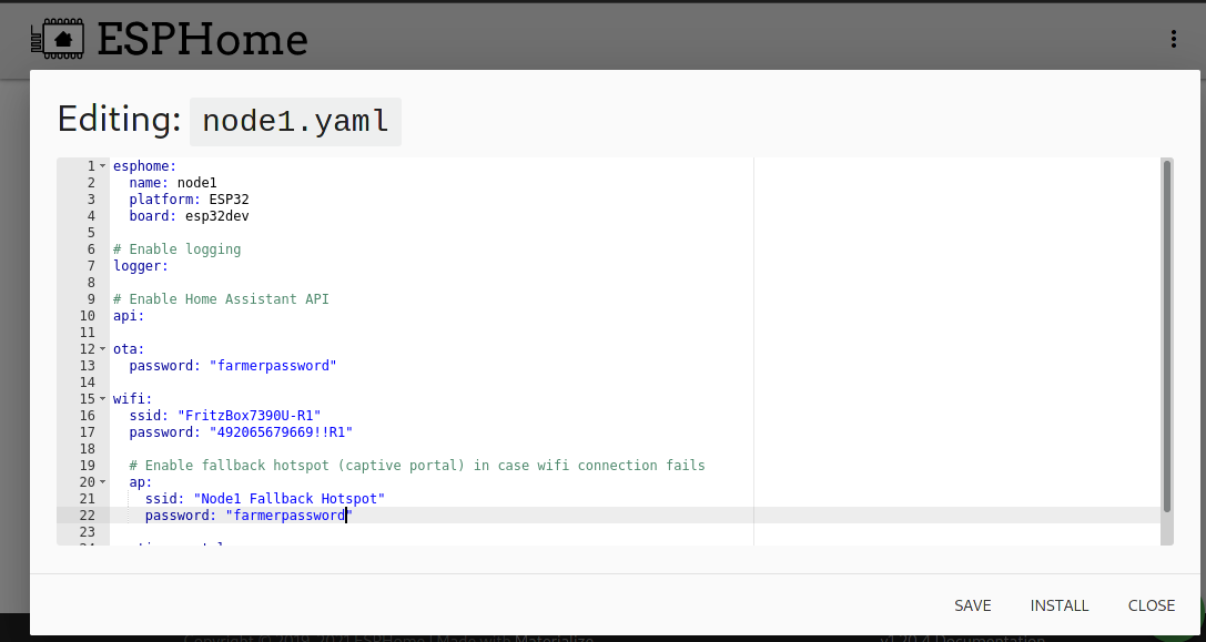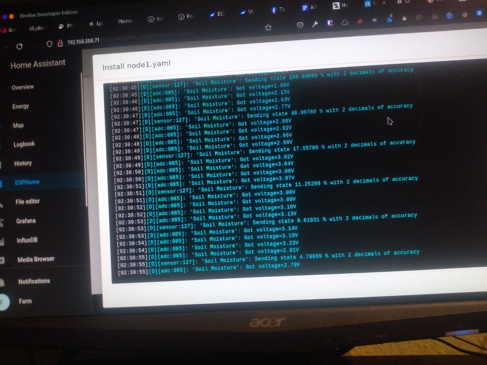 Node1.yaml configuration of ESPHome Node with capacitive soil moisture sensor: