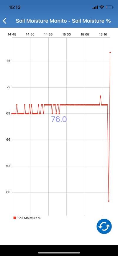 The above figure shows earlier moisture percentage of the point of measurement before fig.6 was obtained. Between the time intervals 14:45 and 15:10 the moisture percentage had a constant run between the values of the 69% to 71%. This indicates by the time the graph in figure 6 was obtained the overall moisture percentages of the soil on the point of measurement had increased from 70% to 80% giving a 10% increase in the moisture content with a space of 120 minutes.