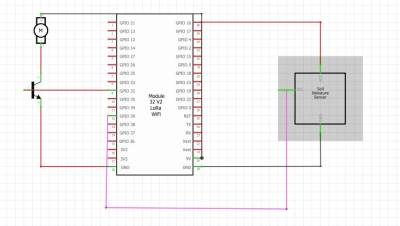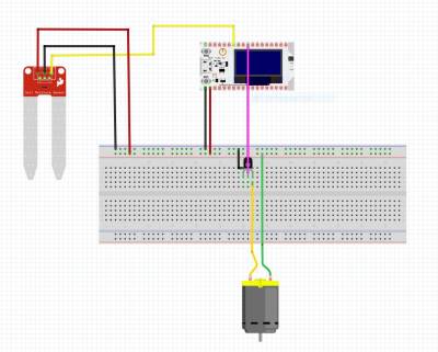 The above diagram was produced in fritzing and shows how the soil moisture sensor, the 5V water pump and the ESP32 Module, are connected and to which pins. The capacitive soil moisture sensor consist of three pins, the GND, VCC and the Analogue pin. The Ground and VCC are connected to the ground and 5V of the ESP32 module respectively via the breadboard. The third pin of the sensor is connected to GPIO 39 of the microcontroller. The pump consist of two pins where one leg is connected to 5V of the microcontroller and the other leg is connected to the collector of the transistor . The base pin of the transistor is connected to GPIO32 of the microcontroller, where the pin mode is set to output.