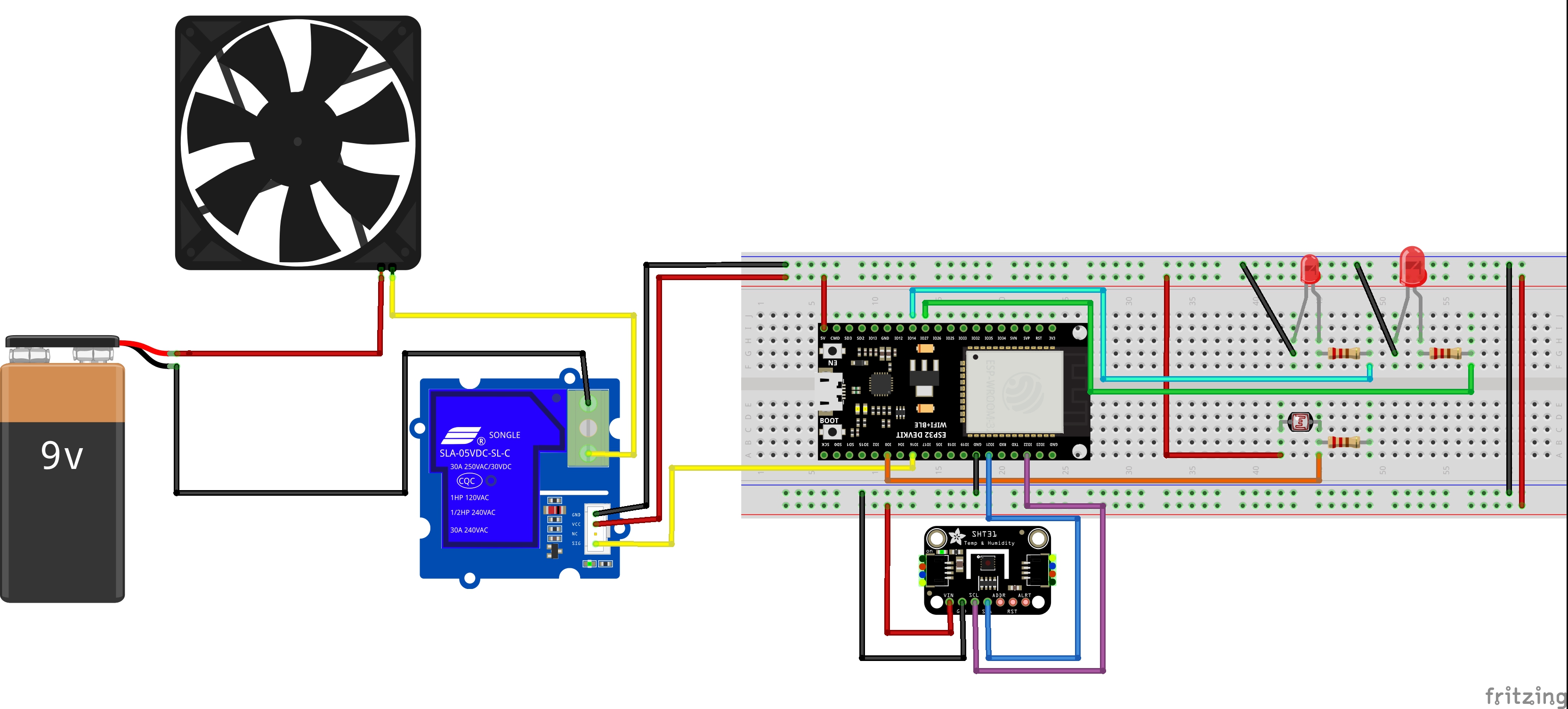 This setup is not just relatively simple to put together but also very efficient and responsive. The different components have also been connected in such a way that there is enough energy available to power up each component in the circuit but the circuit is also kept in an open state (meaning there's no flow of current) while the readings of the sensor remain within a certain limit as stated in the code. A simplified colored view of the setup and its schematic is displayed in the figures below. The 3v relay plays an important role because it helps control the flow of current to the fan. It closes the circuit (allowing the flow of current) based on the commands it receives from the esp32 board and the batteries are there to make sure that there is always enough power being provided to the circuit.
