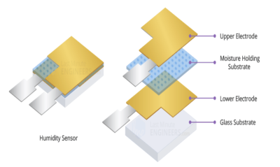 Amongst the various types of humidity sensors, the DHT22 module relies on the principle of Capacitive humidity, in it the design is built around measuring relative humidity. This design involves the use of an electrical conductivity sensor in the form of a layering of two electrodes separated by a moisture holding substrate material, as shown in Fig #. the dielectric material is specifically hygroscopic. With the absorption of moisture from the air, the dialectric constant increases, increasing the capacitance of the sensor. Since the change in the dialectric constant is directly proportional to the value of the relative humidity, a measurement of the change in capacitance will yield the relative humidity level. Resistive humidity will employ the same design with two electrodes separated by the gygroscopic conductive layer. The resistivity of the conductive material will vary inversely with the amount of moisture that is absorbed, higher absorption of water vapor will result in higher conductivity or lower resistivity. 5)