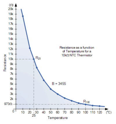 A thermistor is a semiconductor device that changes its resistance when the ambient temperature changes. The term is a conjunction of thermal and resistor, and while most resistors are subject to slight changes due to temperature variations, these devices are purposely engineered so that they are very susceptible to minimal temperature fluctuations. There are 1 type of thermistors, Negative Temperature Coefficient (NTC) and Positive Temperature Coefficient (PTC). The type used by the DHT22 sensor is Negative Temperature Coefficient. The change in resistance is non linear but as a curve, as represented in the example of Figure #. The design and performance of the thermistor is selected by the manufacturer, but for all NTC thermistors as the temperature increases, the resistance decreases. Therefore the coefficient B which defines the behavior of the Thermistor is represented by a curve in which we can see the material resistive change over temperature and can be calculated using the following equation2):