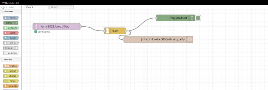Figure 3 setup on node-red showing data from mqtt being stored in a data base (influxdb)