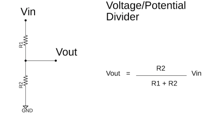 Because the battery used is 9V, we want to make sure that the ADC pin only receives up to 3.3V. Knowing both the Voltage source, the Output Voltage and one of the resistor values, we can then find the other resistor that would complete our circuit by using the Voltage/Potential Divider equation of Figure 4. There are plenty of websites that have very easy to follow tools to find any of the values of our equation. For our purposes we used https://ohmslawcalculator.com/voltage-divider-calculator. Alternatively by knowing the resistors used we can calculate the output voltage. Since we are using the hardware provided in the ELEGOO KIT, we have decided to use one 10k Ohms and one 5k Ohms resistors connected in series, which provide us with an output voltage of 3V.
