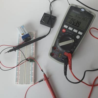 Powering ESP32 directly with a 9v battery is not recommended [29]. Therefore we need to use a voltage regulator to supply the ESP32 with 5 volts only. Using the Pololu voltage regulator and a voltmeter, we regulated the voltage to 5.39 Volts, as shown in the picture below, so the voltage that was reaching the ESP32 was 5.39 Volts.