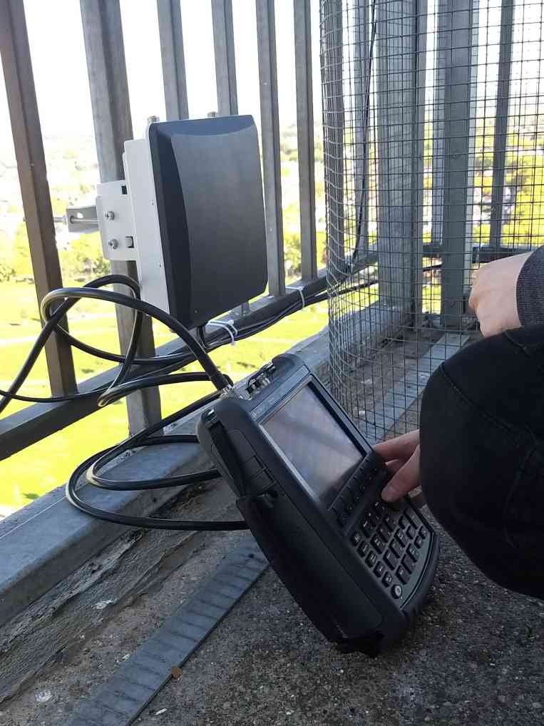 Because of the metal cage encompassing the upper platform of the tower, the antennas had to be placed at a distance, otherwise, their range might be impacted. With the help of the former miner Jörg Kamps from the HSRW FabLab Team, we together designed a simple holder and he could manufacture multiple ones made from stainless steel. These enabled us to specifically tune the distance from the metal cage for each individual antenna. Therefore we used our Network Analyzer which enables us to see the frequency at which the antennas are able to receive data.