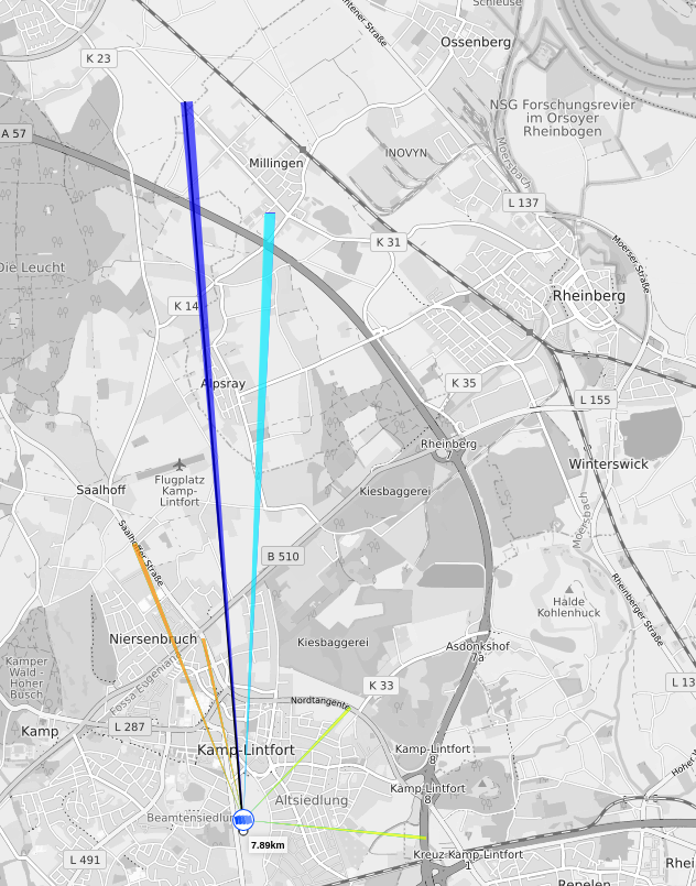 The longest distance (as of right now) that was achieved was almost 8 kilometers long, which is far beyond the general Kamp-Lintfort Area. For us, this is a major success! You can check the current coverage with our north-facing gateway and its antennas here: TTN Mapper
