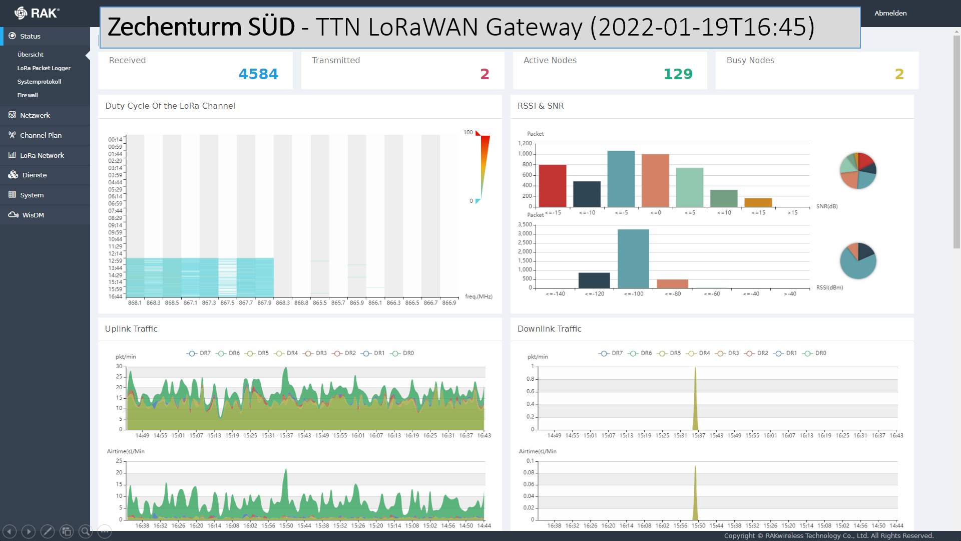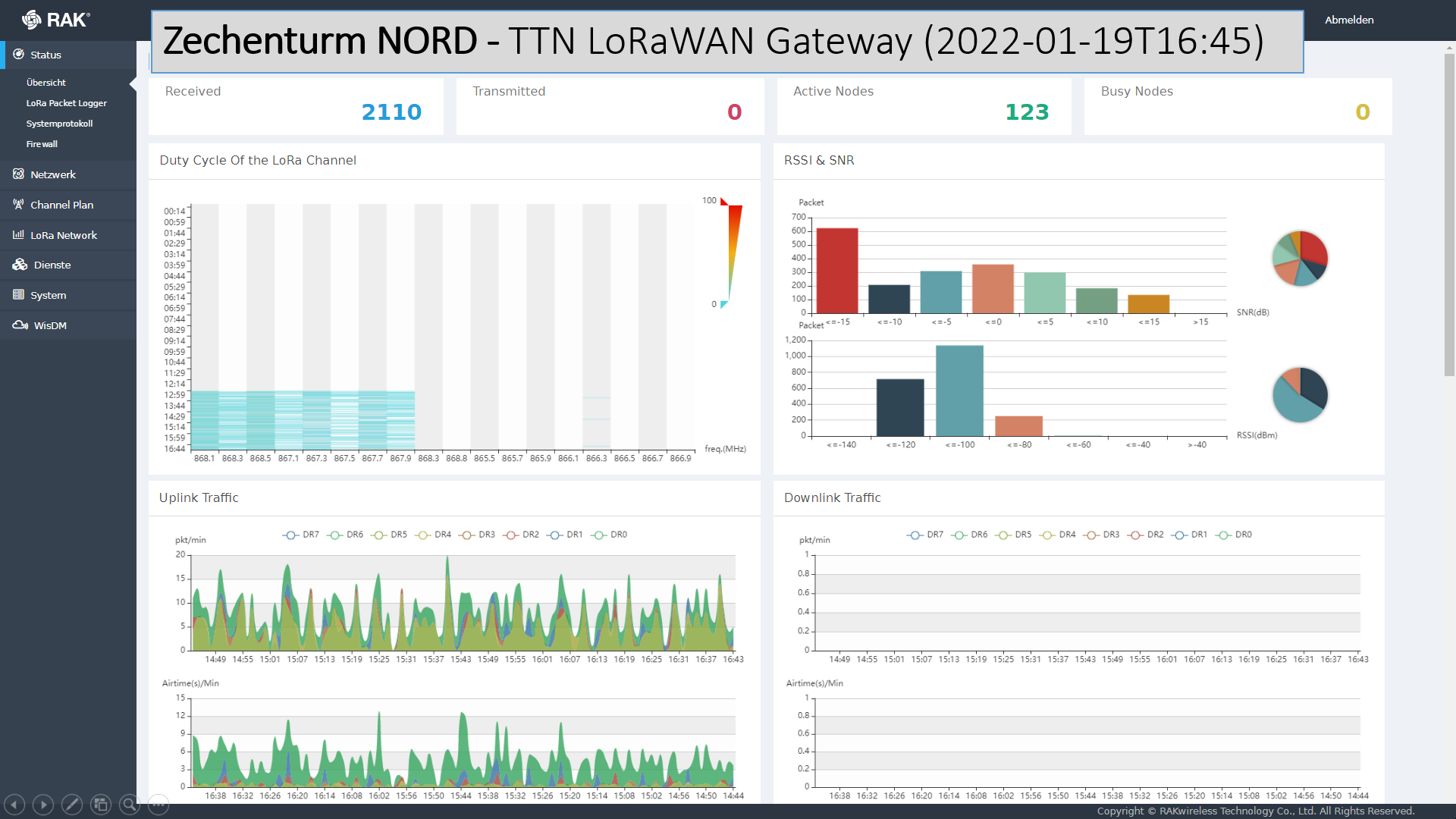 The installation consists of two RAK Wis Gate Edge Pro LoRaWAN Gateways, which both have 16 channels in total. Each gateway is equipped with two rod antennas which are installed at the platform of the Friedrich-Heinrich coal mine tower. The antenna pairs are located at the south-west as well as the north-east corner of the tower, respectively.