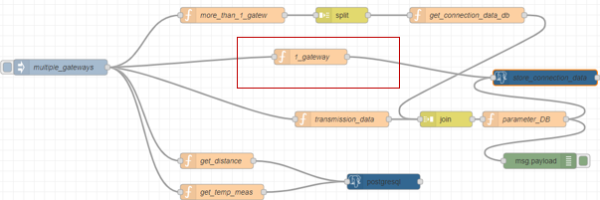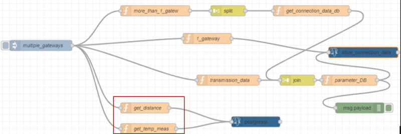 Similar to the example before, the necessary parts of the payload are extracted here and set as parameters for the following query. This was illustrated for “get_distance” in the figure but the same principle can be found in “get_temp_meas”. However, transferred json files that have multiple gateways are a bit more complicated. The function “more_than_1_gatew” checks if the object contains more than one gateway and initializes the payload with the object for the gateways. If not, msg is initialized with null.