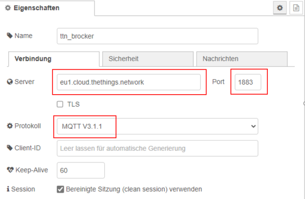 Furthermore, both the generated API key as password and additionally the username have to be provided. Both can be seen for example in figure 35 for this project and have to be added to the properties of MQTT node.