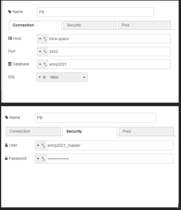 Firstly, the host and the database used must be specified. Also, the database user and the password of the database must be specified. However, it should be noted that if one postgresql node is changed then all postgresql nodes are automatically changed. The measured values for the distance and the temperature are extracted by the nodes “get_distance” and “get_temp_meas” from the payload of the initial json file.