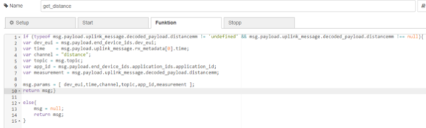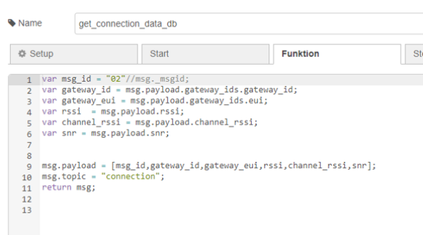 These parameters are extracted individually from the payload and assigned to new variables. This happens only if the array “msg.payload.uplink.rx_metadata” has the length one, i.e. contains only one gateway. If more gateways are contained, msg is initialized with null and nothing is stored in the database. The newly set variables are stored in “msg.params”. “msg.params” contains the parameters which will be used in the following postgresql-node.