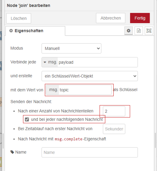 In the join node, the gateways are combined with the connection data. This results in data sets with the same connection data but different gateway information. With the use of the join Node is to be considered that the individual message parts must set in each case unique msg.topics before and that with the properties of the join Node the number of the message parts is specified and also the hook “and with each following message” is set. If this is not done the join node may not be able to process more than 2 separate gateway information. All joined data will be stored as a value object.