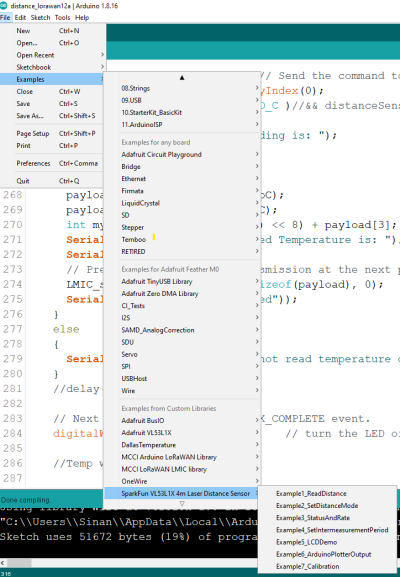Most of the important things happen in the do_send, onEvent and setup functions. “setup” is used to test wheather the distance sensor is available and initialize LMIC.