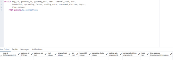 The next dynamic table is “ta_connection”. This uses the “msg_id” and “time_gateway” as primary keys. The table consists of columns that refer to the respective gateway (gateway_id, gateway_eui, rssi, channel_rssi, snr, time_gateway) and the other columns refer to the transmission of the data.
