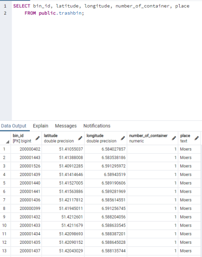 Among the static tables, we have, among others, the table “ta_trashbin”, which stores all trash bins, their location, number of containers, and the city in which they are located. “bin_id” acts as the primary key for this table.