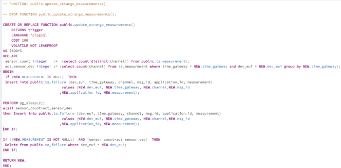 The trigger checks two things firstly whether the data records contain measured values, if not the data record is also written to the failure table. The next condition that is checked is whether all sensors were taken into account during the transmission of the data records. If not, the data records are written into the failure table. If new data records appear that are free of errors, the old data records are deleted from the failure table.