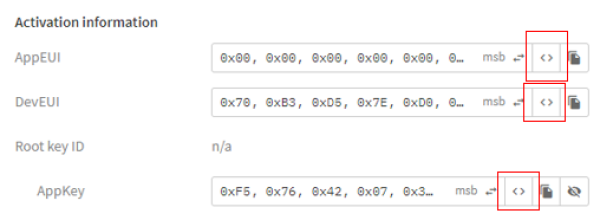 After the end device is created it can be clicked by user. Then a new page opens which contains all parameters for the end device. Here the data formats for the keys DevEui, AppEUI and AppKey can be formatted. It is important to note that the DevEUI and AppEUI keys are entered in the Little Endian Vormat in the script. AppKey is needed in the Big Endian Vormat. This works by pressing “Toggle array formatting” next to the keys. The symbol has been outlined in red in the next figure.
