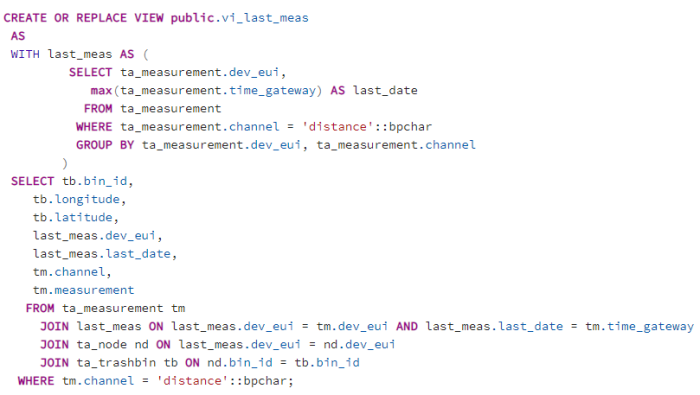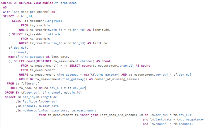 In the representation of the second map presented so far, which contains the last measurements for each device, only the last filling levels are taken into account. All other measured values are not considered. In order to be able to display all measured values and also new values based on new sensors, two basic requirements must be met. First, the measured values must be aggregated and then pivotoized. In the second point, it must be ensured that if a measurement type is added, this is also dynamically taken into account in the pivoted representation.