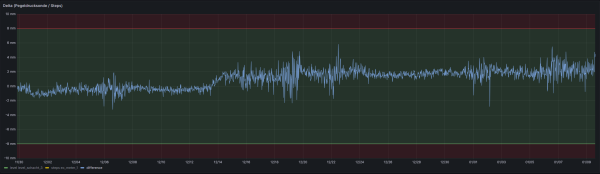 Ein Vergleich mit dem EC-Messstand zeigt geringe Abweichungen, welche jedoch im Rahmen der angegebenen Genauigkeit des Sensors (0.5% FS) liegen:Fig. 2: Delta zwischen Pegeldrucksonde und dem EC-Messstand
