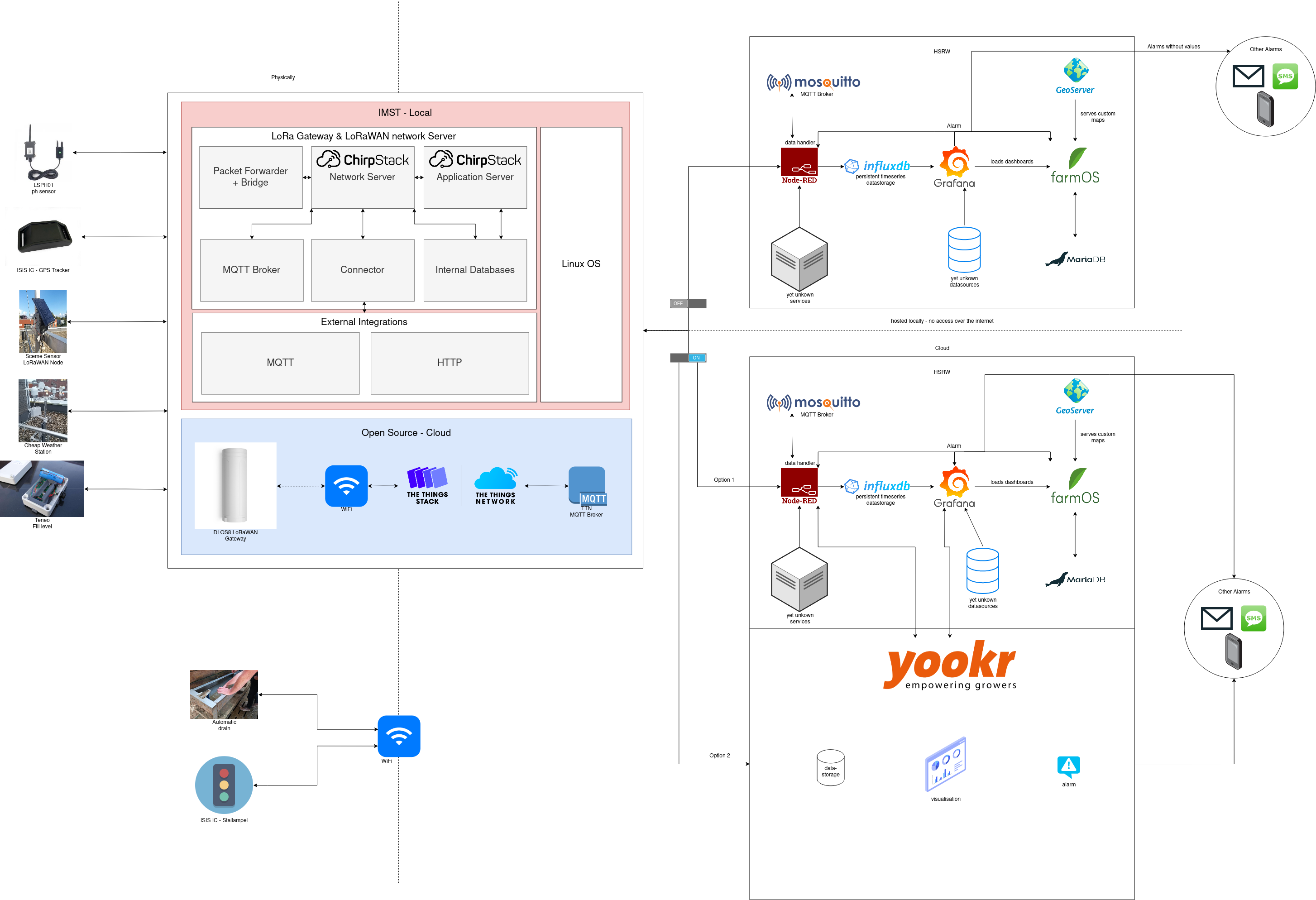 Here you can see the overall architecture of the Internet of Agriculture Project. The online and offline versions are very similar or basically the same with small differences in configuration. Also, it is possible to use a third-party service provider like Yookr, which is part of the IoA project to make and provide all the online services for you.