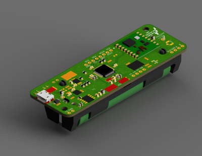 The device is powered by solar and an internal battery. It can also monitor the battery. The battery levels get also logged on the dashboard. This prototype also includes a custom-made circuit board.