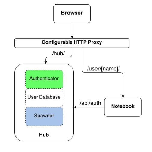 - Hub—designed to manage user accounts and authentication. The hub uses a Spawner when coordinating single-user notebook servers.