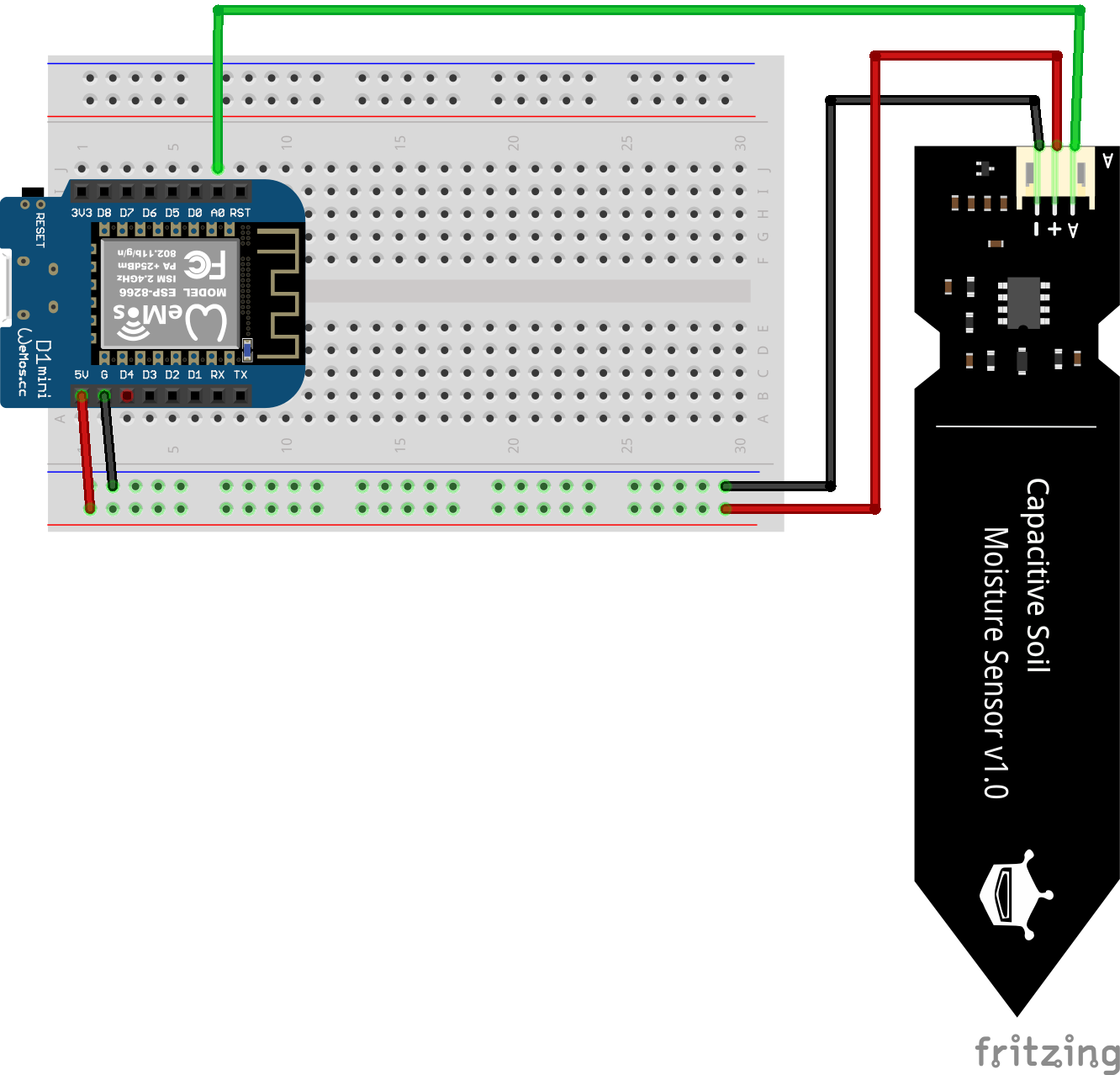 With these common sensors, we don´t need to reinvent the wheel. There are plenty of good tutorials out there on how to use this sensor. One we link here: Capacitive Soil Moisture Sensor - DFRobot Wiki There you will be able to learn how to integrate the sensor into your software as well as how to use it in the real world. Just keep in mind the electronics on top are not protected from the environment. Water shouldn't touch that part!
