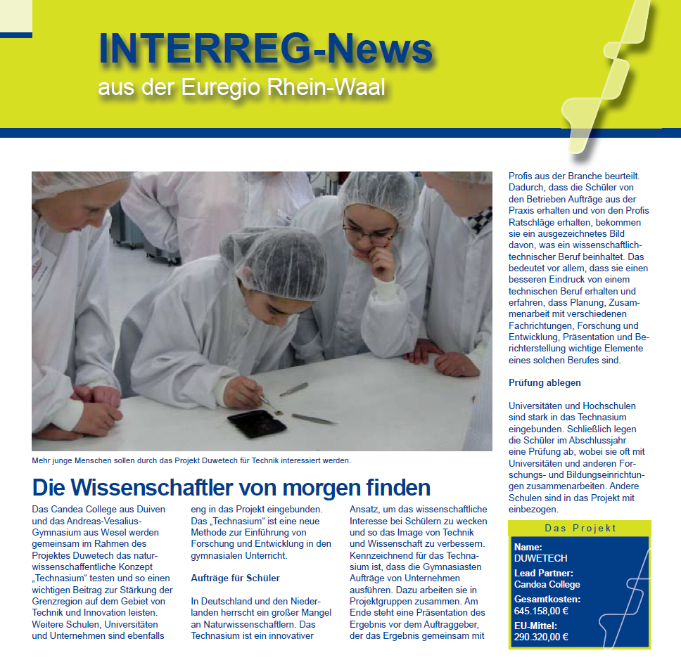 “Das DuWeTech-Projekt ist im Schuljahr 2010/11 als eine Kooperation zwischen dem Candea College Duiven (Du) und dem Andreas-Vesalius-Gymnasium in Wesel (We) entstanden. Es sollte die Unterrrichtsform des Technasiums (Tech) in Deutschland bekannt machen.