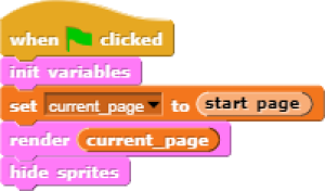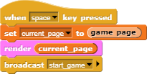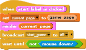 In the game process we use when block to catch the click event from the stage and change the current page and broadcasting to tell the other blocks that game is starting.