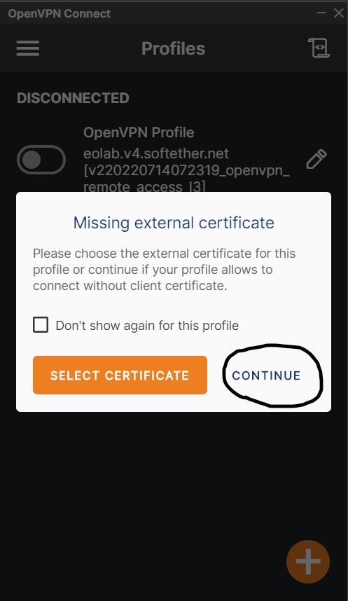 - “Connect” to the VPN. “Continue” when asked for a “Missing external certificate”