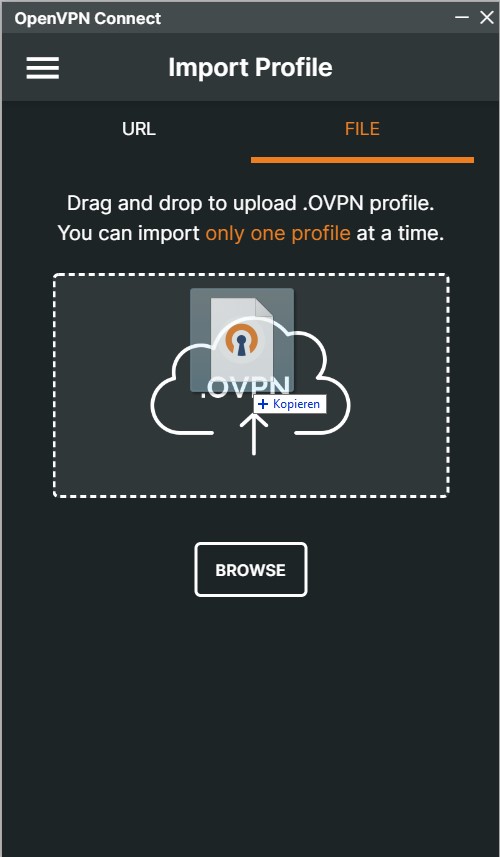 - After you downloaded the file, Drag and Drop it into the OVPN Connect App. Everything besides the username and password will be automagically be filled out for you. You can now fill in the username and password which are provided by our on-site team. To type in the password just check “Save password”. After all of that, you can now just click connect.
