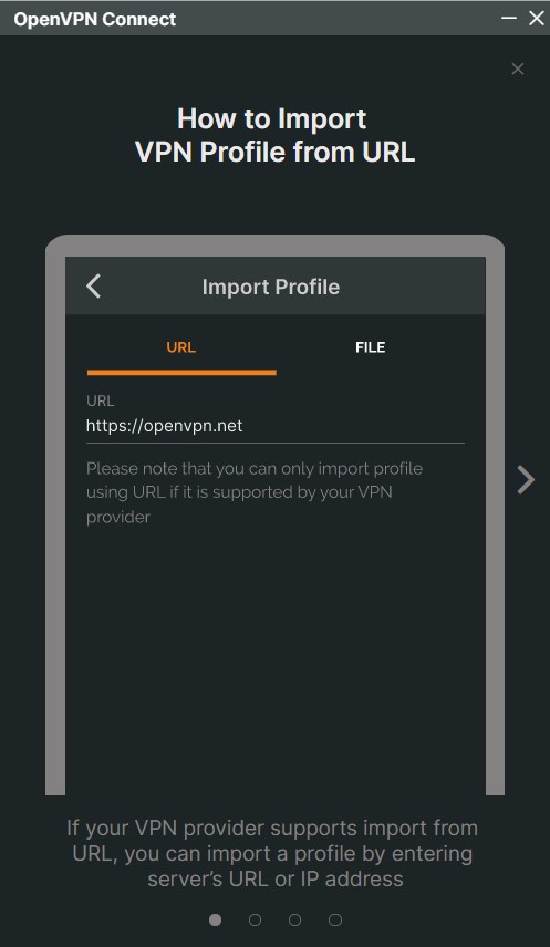 Fig. 3 It will show you guide on how to use the app. We will use the “import from file”-feature. To exit the guide, go through the four pages or hit the “Cross”-Icon in the top right corner. You will also need to expect some stuff given by OpenVPN. - You should now be at the “Import Profile”-Screen. It consists of two tabs: “URL” and “File”. Please select “File”. It will then ask you to upload a so-called “.OVPN”-File. This file contains all the necessary information to use our VPN (besides the login information). You can download it right here: EOLab.ovpn