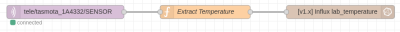 The last node we need is the influxdb out-node. Attach this to the output of the function node. Here you just need to select your influxdb and give the measurement a name that is easily distinguishable. I choose lab_temperature. You can now deploy your flow by selecting Deploy. Your flow should look something like this:
